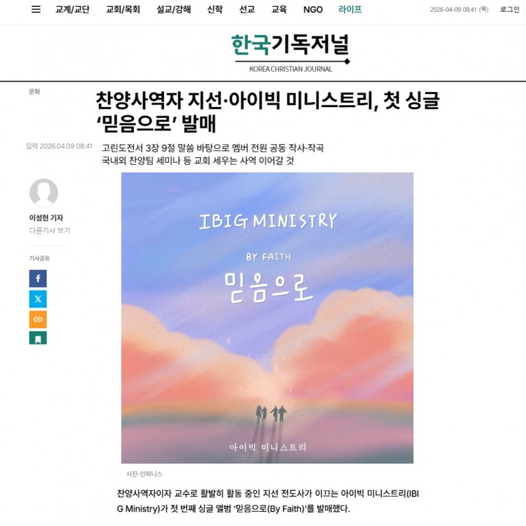 [기사] 찬양사역자 지선·아이빅 미니스트리, 첫 싱글 ‘믿음으로’ 발매(한국기독저널)