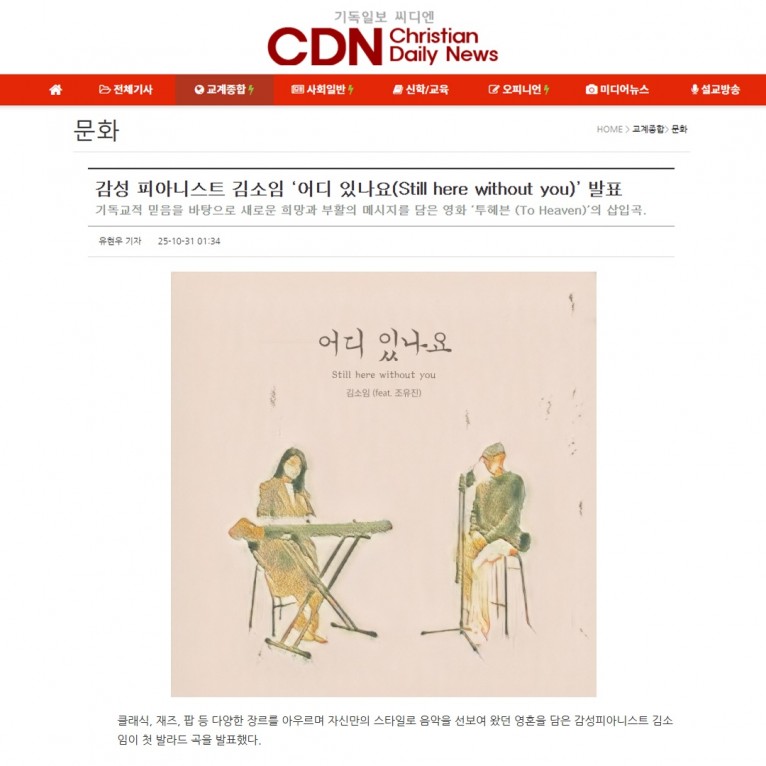 [기사] 감성 피아니스트 김소임 ‘어디 있나요(Still here without you)’ 발표(기독일보 씨디엔)